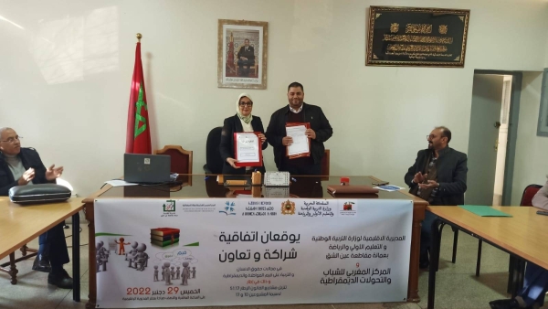 احتضنت الأسبوع الماضي المديرية الإقليمية لوزارة التربية الوطنية والتعليم الأولي والرياضة بعمالة مقاطعة عين الشق حفل توقيع اتفاقية شراكة وتعاون بين المديرية الإقليمية لوزارة التربية الوطنية والمركز المغربي للشباب والتحولات الديمقراطية، الاتفاقية تهدف إلى إرساء آليات للتعاون بين الجانبين من أجل تعزيز ثقافة حقوق الإنسان والديمقراطية في الوسط المدرسي، والتي شهدت حضور كل من رئيس مصلحة الشؤون التربوية ورئيسة مصلحة الشؤون القانونية والتواصل والشراكة ومدير مؤسسة التفتح للتربية والتكوين ” المنظر العام “.