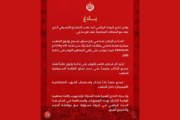 واختتم البلاغ بالتأكيد على أهمية التزام الجماهير بهذه التوجيهات لضمان نجاح المباراة وخلق أجواء مسؤولة وآمنة، مع دعم الفريق وتشجيعه ضمن اطار منظم.