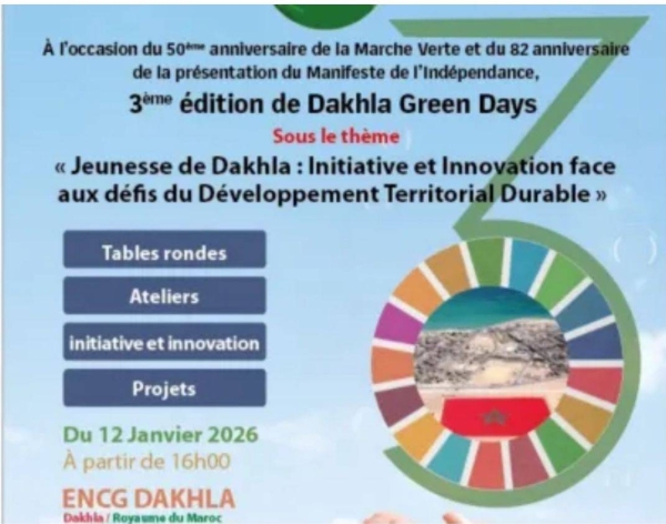 عرفت مدينة الداخلة، اليوم الاثنين 12 يناير 2026، انطلاق فعاليات النسخة الثالثة من التظاهرة البيئية والتربوية والمواطنة “الأيام الخضراء للداخلة”، بتنظيم شبكة خليج الداخلة للمناخ والتنمية المستدامة وجمعية الداخلة لاكون، بدعم من مؤسسة أزورا، وبشراكة مع مجموعة من الفاعلين الجمعويين والمؤسساتيين والتربويين.