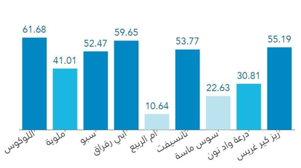 بالنسبة لسدود حوض سبو، فسجلت نسبة 52.47 في المائة، وسدود حوض ملوية نسبة 41 في المائة، بينما سجلت سدود حوض درعة-واد نون نسبة 30.81 في المائة، وسدود حوض سوس-ماسة نسبة 22.63 في المائة، فيما احتلت سدود حوض أم الربيع المرتبة الأخيرة نسبة ملء ب10.64 في المائة فقط.
