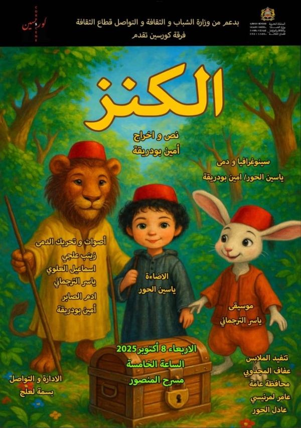 أعلنت فرقة كورسين للمسرح عن تقديم مسرحيتها الجديدة “الكنز”، من تأليف وإخراج أمين بودريقة، وذلك بدعم من وزارة الشباب والثقافة والتواصل (قطاع الثقافة)، يوم الأربعاء 8 أكتوبر 2025، على الساعة الرابعة مساءً بمسرح المنصور – الرباط.