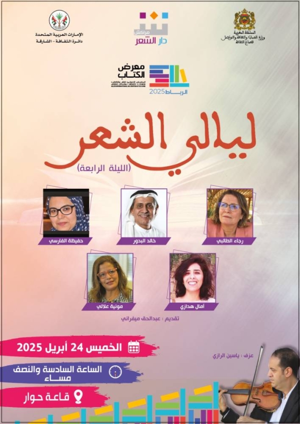 ويشارك الشعراء: رجاء الطالبي، خالد البدور، حفيظة الفارسي، آمال هدازي، مونية علالي، في الليلة الرابعة، يوم الخميس 24 أبريل على الساعة السادسة والنصف مساء بقاعة حوار داخل فضاء المعرض، فيما يحضر في المصاحبة الموسيقية الفنان ياسين الرازي، هذه الليلة التي يشرف على تقديم فقراتها الشاعر عبدالحق ميفراني.