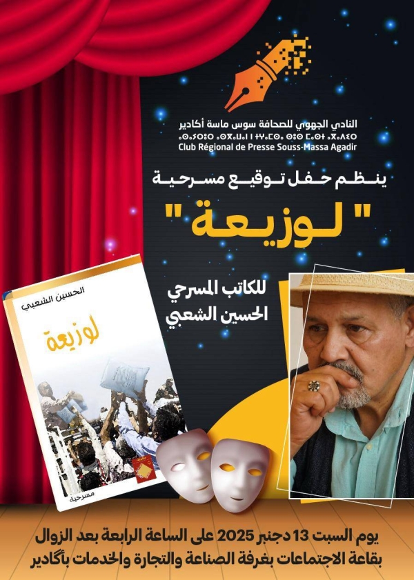 ينظم النادي الجهوي للصحافة بسوس ماسة، يوم السبت 13 دجنبر الجاري، حفل توقيع مسرحية “لوزيعة” للكاتب والناقد المسرحي الحسين الشعبي، وذلك ابتداءً من الساعة الرابعة بعد الزوال بقاعة الاجتماعات بغرفة الصناعة والتجارة والخدمات بأكادير.