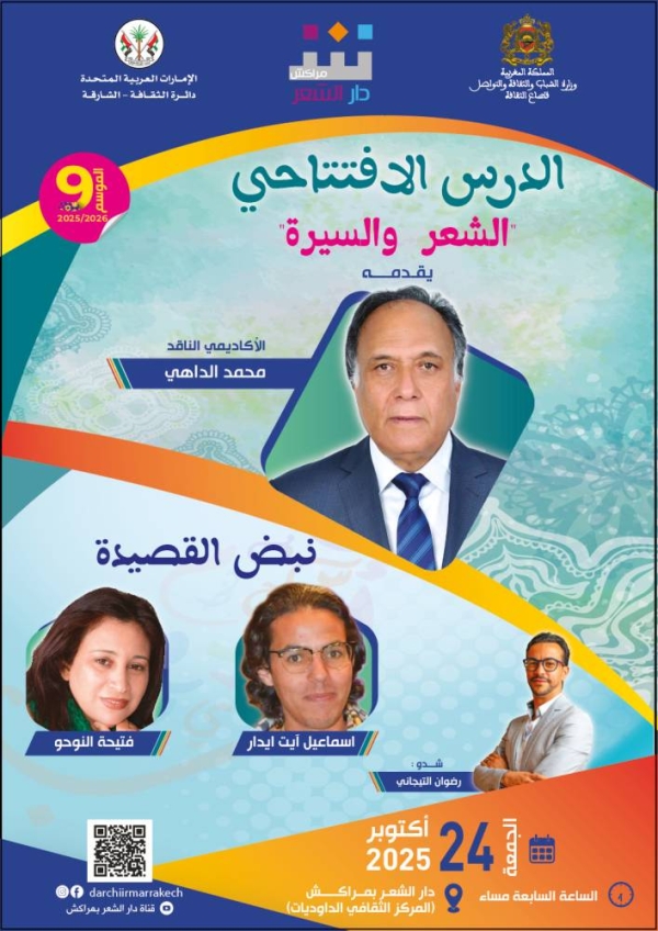 تنظم دار الشعر بمراكش، يوم الجمعة 24 أكتوبر الجاري على الساعة السابعة مساء بمقر الدار (الكائن بالمركز الثقافي الداوديات)، الدرس الافتتاحي للموسم التاسع لبرنامجها الثقافي والشعري الجديد، وهي تظاهرة شعرية ونقدية ومعرفية، حرصت الدار أن تستقصي من خلالها قضايا وأسئلة تتعلق براهن الخطاب الشعري.