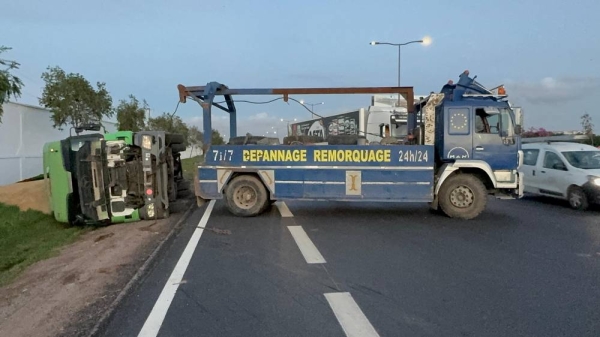 بالصور.. إنقلاب شاحنة تحمل القمح بالطريق السيار لعين السبع في اتجاه الجديدة