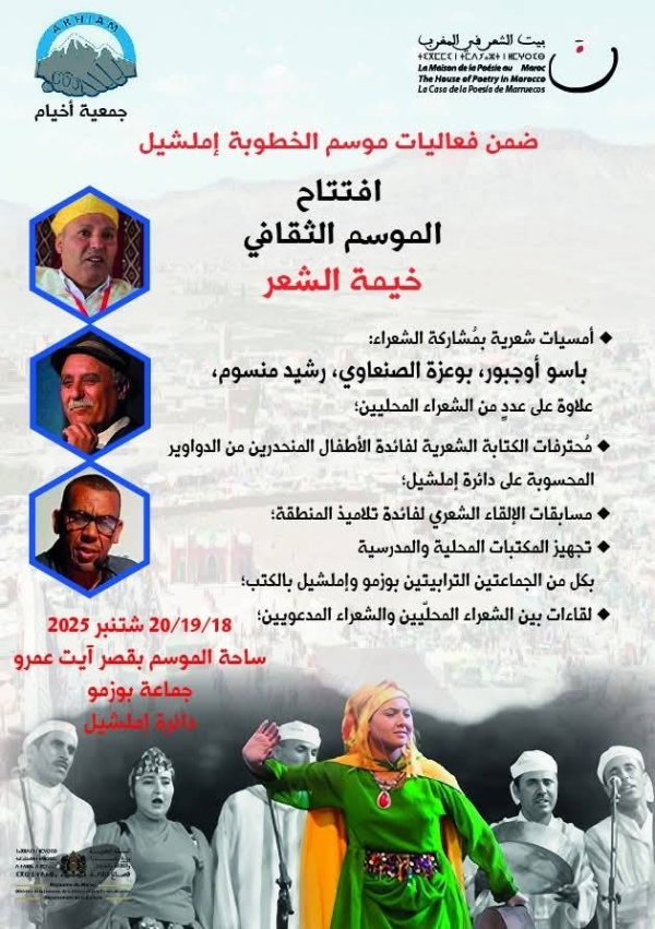 يطلق بيت الشعر في المغرب موسمه الثقافي من أعالي جبال الأطلس الكبير، انطلاقاً من موسم الخطوبة التقليدي بمنطقة إملشيل، خلال الفترة من 18 إلى 20 شتنبر 2025، وذلك في إطار تعاون مع جمعية أخيام.