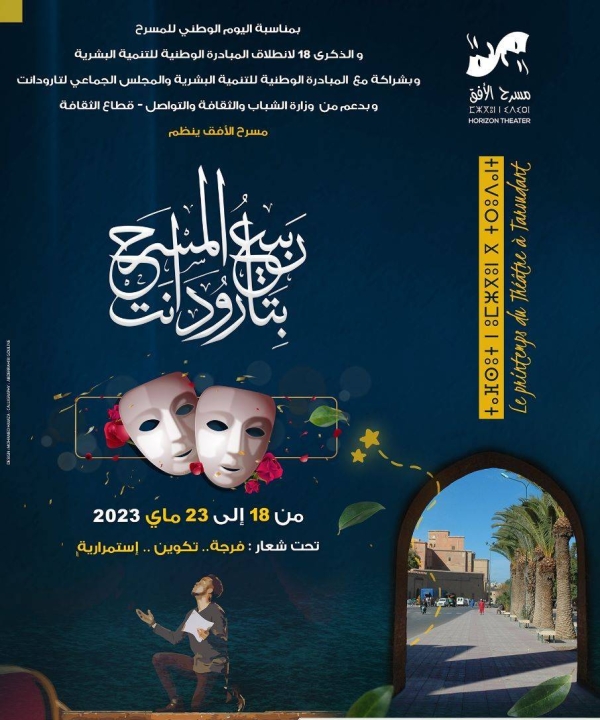 تحتضن مدينة تارودانت ما بين 18 و23 ماي 2023 الدورة الأولى لفعاليات مهرجان ” ربيع المسرح بتارودانت ” والذي تنظمه جمعية مسرح الأفق تحت شعار ” فرجة، تكوين، استمرارية ” بمناسبة اليوم الوطني للمسرح والذكرى 18 لانطلاق المبادرة الوطنية للتنمية البشرية، الدورة الأولى للمهرجان ستعرف تكريم الجمعية المنظمة الفنانين محمد الجم وعبد الله ديدان وفرقة تكدة للمسرح والفنون الشعبية وجمعية الشعاع للمسرح بتارودانت.