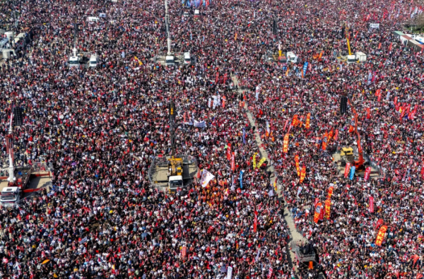 احتشد مئات الآلاف في اسطنبول السبت، بدعوة من حزب الشعب الجمهوري، أكبر أحزاب المعارضة الذي ينتمي إليه أكرم إمام أوغلو رئيس بلدية العاصمة الاقتصادية لتركيا، وذلك للتنديد باعتقاله رغم حملة القمع المتواصلة التي يتعر ض لها المتظاهرون.
