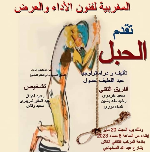 تقدم الجمعية المغربية لفنون الأداء والعرض تحت إشراف مقاطعة الفداء، ، العرض ما قبل الأول لمسرحيتها الجديدة:” الحبل” بقاعة المركب الثقافي للفداء (الكائن بشارع عبد الله الصنهاجي) بالدار البيضاء عل الساعة 6 مساء يوم السبت 20 ماي الجاري.