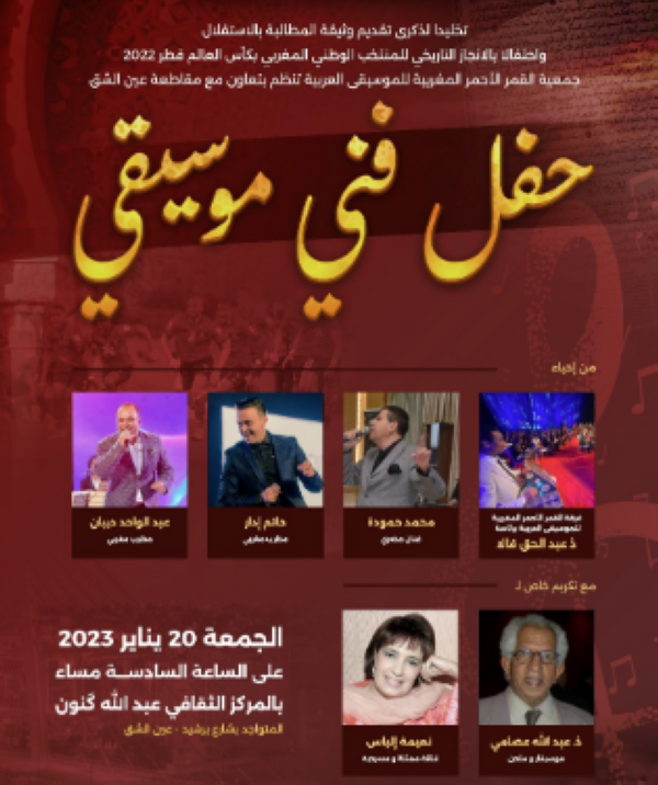 الحفل الموسيقي الذي نظم من طرف جمعية القمر الأحمر للموسيقى العربية والثقافة والفن، بتعاون وتنسيق مع مقاطعة عين الشق،لامس مناسبتين عزيزتين على قلوب المغاربة ،ذكرى تقديم وثيقة الاستقلال وما تحمل من دلالات وطنية، وكذلك ذكرى الملحمة الرياضية الكبيرة التي قدمها الفريق الوطني.المنظمون.