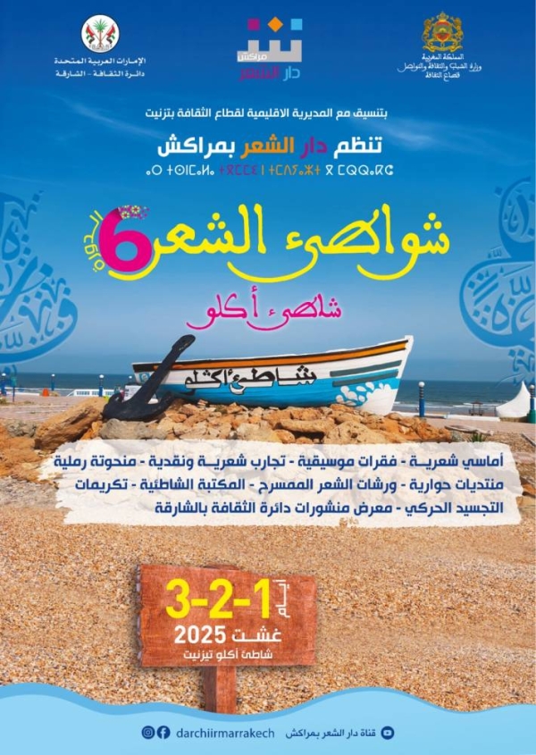تنظم دار الشعر بمراكش، بتنسيق مع المديرية الاقليمية لقطاع الثقافة بتيزنيت، فعاليات الدورة السادسة لتظاهرة “شواطئ الشعر” وذلك أيام: 1- 2- 3 غشت 2025 بشاطئ أكلو(تيزنيت).