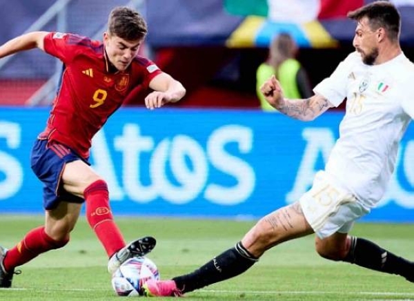 حسم المنتخب الإسباني الدربي المتوس طي أمام نظيره الإيطالي وفاز عليه 2-1 الخميس في نصف نهائي دوري الأمم الأوروبية، ليضرب موعدا في المباراة النهائية مع المنتخب الكرواتي الأحد.