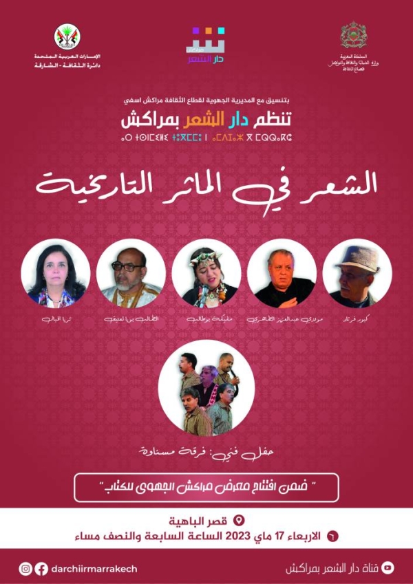 تنظم دار الشعر بمراكش، بتنسيق مع المديرية الجهوية لقطاع الثقافة مراكش آسفي، يوم الأربعاء 17 ماي على الساعة السابعة والنصف مساء، فقرة جديدة من برنامج الشعر في المأثر التاريخية. واختارت الدار، ضمن استراتيجيتها الخروج بالشعر إلى الفضاءات العمومية والتي وسمت برمجتها الشعرية والثقافية منذ التأسيس(2017)، أن يلتقي الشعراء في فضاء قصر الباهية التاريخي، في لحظة شعرية وفنية وتحت ظلال أشجار حدائق الشعر بمراكش واحتفاء بشجرة الشعر المغربي الوارفة.