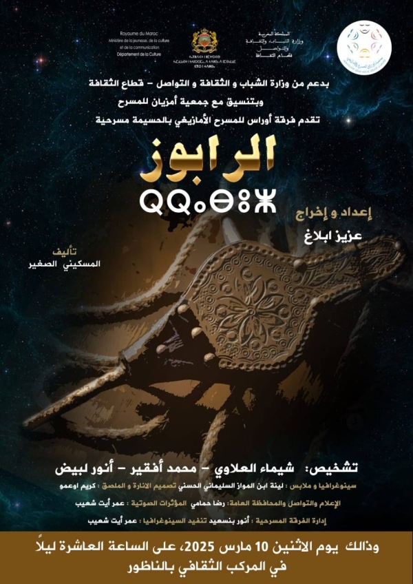 مسرحية “الرابوز” (ARABOUZ) من تأليف المسكيني الصغير، إعداد وإخراج عزيز أبلاغ، تشخيص محمد افقير، شيماء العلاوي، أنور البيض، سينوغرافيا وملابس لينة ابن المواز السليماني الحسني، تصميم الإنارة والملصق كريم أوعمو، إدارة الفرقة المسرحية أنور بنسعيد، تنفيذ السينوغرافيا والمؤثرات الصوتية عمر أيت شعيب، الإعلام والتواصل والمحافظة العامة رضا حمامي، إنتاج جمعية أوراس للمسرح الامازيغي بالحسيمة.
