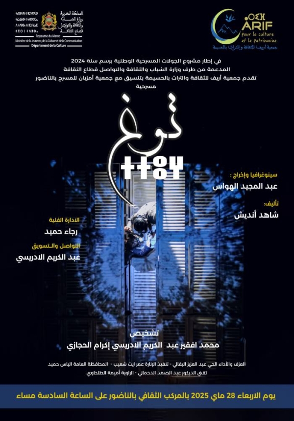 مسرحية “توغ” (TTUGH) من تأليف شاهد أنديش، سينوغرافيا وإخراج عبد المجيد الهواس، إنتاج جمعية أريف للثقافة والتراث بالحسيمة، في إطار مشروع الجولات المسرحية الوطنية موضوع شراكة مع وزارة الشباب والثقافة والتواصل قطاع الثقافة برسم سنة 2024، تشخيص: إكرام الحجازي، محمد أفقير، عبد الكريم الإدريسي، تنفيذ الإنارة: عمر آيت شعيب، العزف والأداء الحي: عبد العزيز البقالي، المحافظة العامة: إلياس حميد، تقني الديكور: عبد الصمد الدحمان، الراوية: أميمة الطلحاوي، الإدارة الفنية: رجاء حميد، التواصل والتسويق: عبد الكريم الإدريسي.