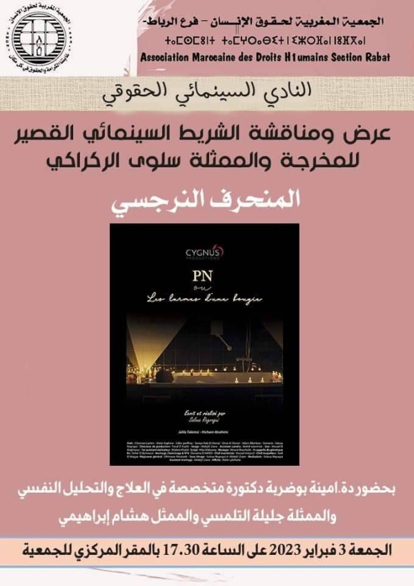 ينظم النادي السينمائي الحقوقي – فرع الرباط – يوم الجمعة 3 فبراير 2023على الساعة الخامسة والنصف مساء بالمقرالمركزي للجمعية المغربية لحقوق الانسان بالرباط ، عرض ومناقشة الفيلم السينمائي القصير بعنوان “المنحرف النرجسي” للمخرجة و الممثلة سلوى الركراكي و بحضور الممثلة جليلة التلمساني و الممثل هشام الابراهيمي والدكتورة أمينة بوضربة.