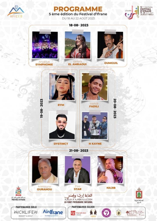 أعلنت “جمعية منتدى إفران للثقافة و التنمية” عن تنظيم الدورة الخامسة لمهرجان إفران ،خلال الفترة الممتدة من 18 إلى 22 غشت الجاري ،بفقرات متنوعة، و بمشاركة ثلة من الفنانين و الفنانات يمثلون أنماطا موسيقية مختلفة.