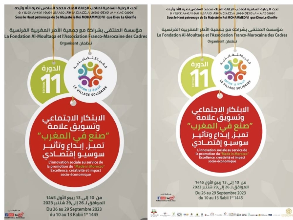 تحت الرعاية السامية لصاحب الجلالة الملك محمد السادس نصره الله، تنظم مؤسسة الملتقى والجمعية الفرنسية المغربية للأطر، الدورة الحادية عشر للقرية التضامنية تحت شعار “الابتكار الاجتماعي وتسويق علامة “صنع في المغرب” تميز، إبداع وتأثير سوسيو إقتصادي”، وذلك من 26 إلى 29 شتنبر 2023 بمقر الزاوية القادرية البودشيشية بمداغ – إقليم بركان.