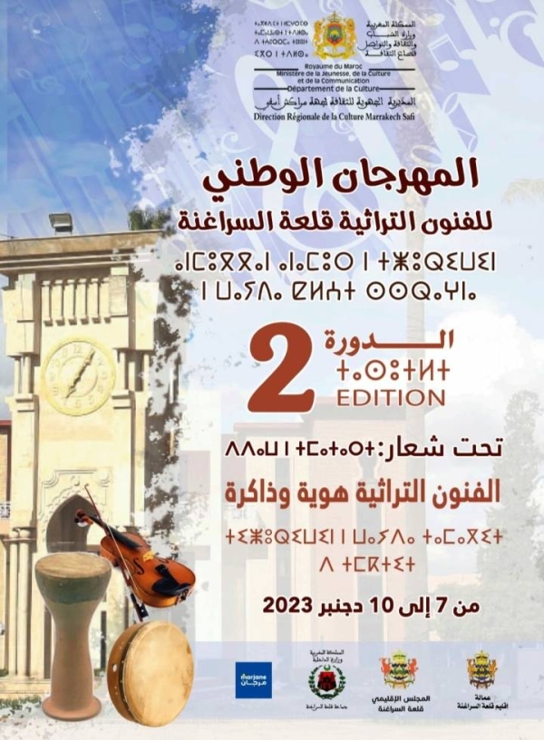 تنظم المديرية الجهوية للثقافة مراكش أسفي بشراكة مع عمالة إقليم قلعة السراغنة والمجلس الإقليمي وجماعة مدينة قلعة السراغنة فعاليات الدورة الثانية للمهرجان الوطني للفنون التراثية تحت شعار “الفنون التراثية..هوية وذاكرة” في الفترة الممتدة ما بين 7 و10 دجنبر 2023 بساحة جنان روما ودار الثقافة قلعة السراغنة.