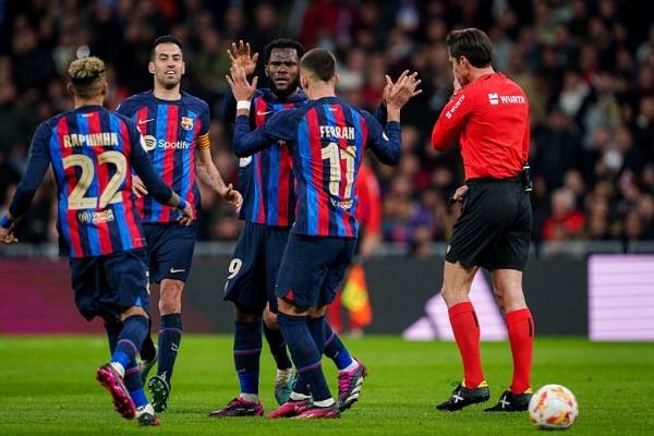 وضع برشلونة قدما في النهائي بفوز ثمين في مباراة الكلاسيكو على مضيفه ريال مدريد 1-صفر الخميس، ضمن ذهاب نصف نهائي مسابقة كأس إسبانيا في كرة القدم. ووقع ريال على ملعبه “سانتياغو برنابيو” في المحظور اذ أهدى هدف المباراة الوحيد لغريمه بداية من خطأ في التمرير من الفرنسي إدواردو كامافينغا استغله لاعبو برشلونة بتسديدة اصطدمت بمدافع الميرينغي البرازيلي إيدر ميليتاو وتحولت إلى الشباك عن طريق الخطأ (26). وتقام مباراة الإياب على ملعب “كامب نو” في 5 نيسان/أبريل المقبل. وفشل ريال في الثأر من خسارته أمام برشلونة في نهائي الكأس السوبر الإسبانية 1-3 في العاصمة السعودية الرياض في 15 كانون الثاني/يناير في أو ل ألقاب لاعب وسطه السابق مدربه الحالي تشافي هرنانديس. بعد دقيقة من صافرة البداية، انطلق ريال بالكرة ليمرر دانيال كارفاخال في العمق إلى الكرواتي لوكا مودريتش الذي لم يكن متسللا ، فسدد من الجهة اليمنى كرة في الشباك الخارجية. واعتقد ريال انه افتتح التسجيل بعد هجمة من البرازيلي فينسيوس جونيور على الجهة اليسرى داخل المنطقة ليمرر إلى القائم الثاني إلى كريم بنزيمة الذي سيطر على الكرة بصدره وسدد بقدمه اليسرى في الشباك، إلا أن الحكم ألغى الهدف بداعي التسلل على المهاجم الفرنسي (12). وانتظر برشلونة حتى الدقيقة 22 للوصول إلى منطقة ريال بعد ركلة حرة على بعد 35 مترا نفذها ماركوس ألونسو داخل المنطقة أبعدها الأوروغوياني فيديريكو فالفيردي. وافتتح برشلونة التسجيل بالنيران الصديقة بعد تمريرة سيئة من كامافينغا وخطأ من المدافع البرازيلي إيدر ميليتاو الذي أعاد الكرة إلى شباك فريقه بعد تمريرة من فيران توريس إلى العاجي فرانك كيسييه على يسار المنطقة، ليسدد الأخير ويصد الحارس البلجيكي تيبو كورتوا فتعود الكرة إلى ميليتاو وتصطدم به وفي المرمى (27). وألغى الحكم الهدف بداعي التسلل على رافينيا عندما مرر توريس إلى كيسييه، إلا أن العودة إلى حكم الفيديو المساعد “في آيه آر” أكد صحة الهدف. وأهدر كارفاخال هدف التعادل بعد تمريرة من كروس على الجهة اليسرى على بعد 30 مترا ، تابعها الاسباني على الطاير فوق المرمى (41). في الشوط الثاني، حاول فينيسيوس بتسديدة قوية صدها الحارس الالماني مارك أندريه تير شتيغن (57)، في حين وقف أنسو فاتي الذي دخل بدلا من رافينيا حائلا دون مضاعفة فريقه النتيجة بعد تسديدة من كيسييه مرت عن كورتوا لتصطدم بمهاجم برشلونة (72). ودفع أنشيلوتي بالبرازيلي رودريغو بدلا من ناتشو والفرنسي أوريليان تشواميني مكان الالماني توني كروس وألفارو رودريغيس بدلا من مودريتش لتنشيط الهجوم، ورد تشافي باخراج كيسييه وادخال سيرجي روبرتو بهدف الحفاظ على النتيجة. سدد رودريغو كرة قوية من خارج المنطقة على يسار الحارس تير شتيغن (90)، من دون أن يدرك ريال التعادل.