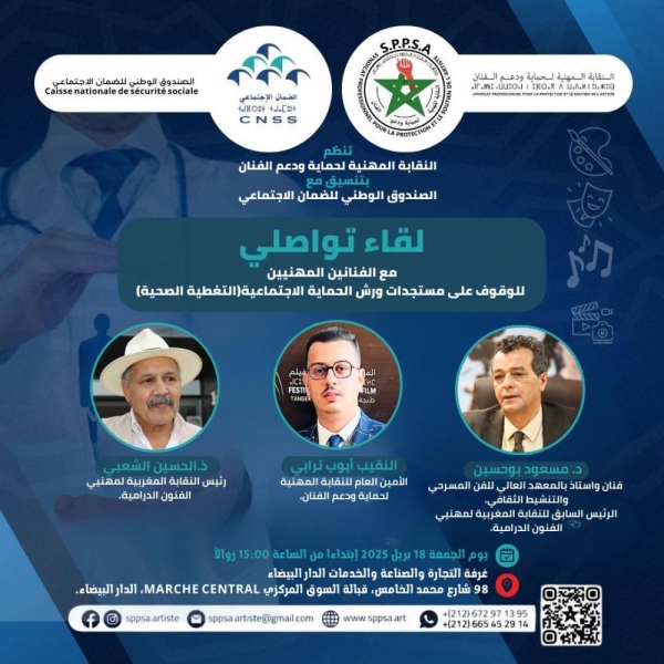 تنظم النقابة المهنية لحماية ودعم الفنان ، بتنسيق مع الصندوق الوطني للضمان الاجتماعي لقاء تواصليا مع الفنانين المهنيين للوقوف على مستجدات ورش الحماية والاجتماعية المتعلق بالفنان (التغطية الصحية)، وذلك يوم الجمعة 18 أبريل 2025 ابتداءا من الساعة 15:00 الثالثة زوالاً بغرفةالصناعة والتجارة والخدمات لجهة الدار البيضاء سطات.