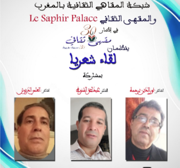 بدعم من وزارة الشباب والثقافة والتواصل قطاع الثقافة ، تنظم شبكة المقاهي الثقافية بالمغرب والمقهى الثقافي le saphir palace ،لقاء شعريا في إطار مشروع “30 مقهى ثقافي 30 مدينة مغربية ” بمشاركة الشعراء نورالدين برحمة ، وعبدالحق الشنوفي والعلمي الديوش .