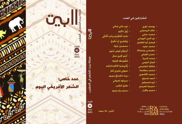بمُناسبة الاحتفال بالرّباط عاصمةً للثقافة الأفريقيّة وانعقاد مهرجان الشِّعر الأفريقيّ أيام 5/6/7 ماي 2023 بالرباط، أصدرَ بيت الشِّعر في المغرب عددًا جديدًا من مجلّة “البيت” (العدد 42)، خاصًّا بالشّعريّة الأفريقيّة.