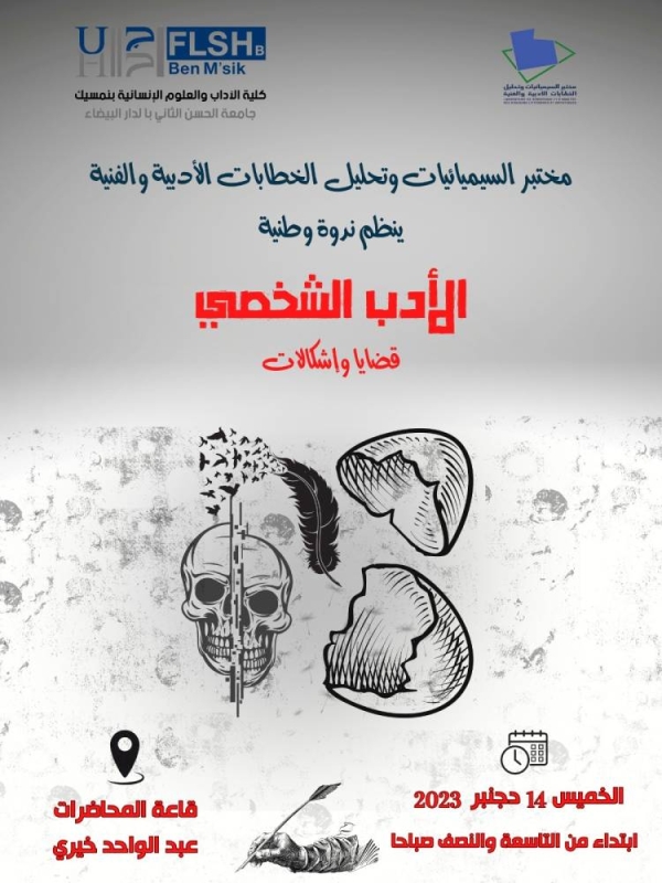 ينظم مختبر السيميائيات وتحليل الخطابات الأدبية والفنية، يوم الخميس 14 دجنبر الجاري، ندوة وطنية، بكلية الآداب والعلوم الإنسانية بنمسيك بالدار الدار البيضاء، حول الأدب الشخصي.