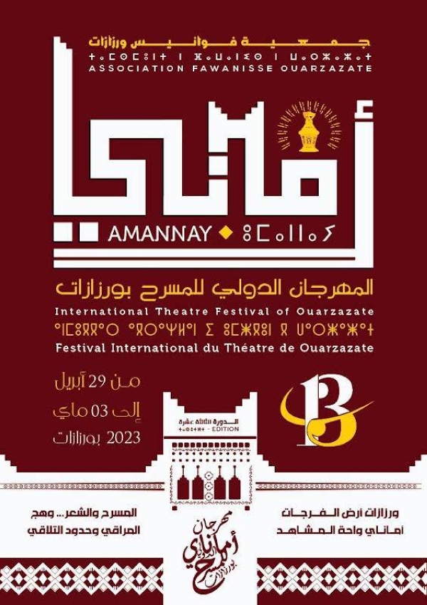 أعلنت جمعية فوانيس ورزازات عن فتح باب التشريح للمشاركة في المسابقة الرسمية للدورة الثالثة عشرة لمهرجان ” أماناي” الدولي للمسرح بورزازات، الذي ينظم بشراكة مع وزارة الشباب والثقافة والتواصل ــ قطاع الثقافة ــ ، بعد أن اختارت إدارة المهرجان ” المسرح والشعر ” كتيمة رئيسة لدورة المهرجان الدولي للمسرح، الذي سينعقد خلال الفترة الممتدة ما بين 29 أبريل و03 ماي 2023 شعار ” الْمَسْرَحُ وَالشِّعْرُ … وَهَجُ الْمَرَاقِي وَحُدُودُ التَّلَاقِي “.