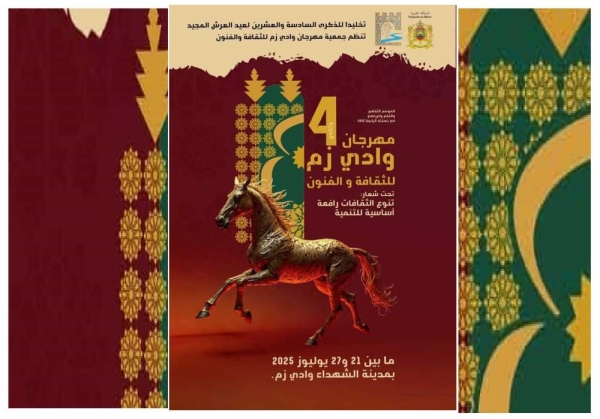 كشفت إدارة مهرجان وادي زم للثقافة والفنون، عن اللائحة النهائية لفرق التبوريدة المشاركة في فقرات النسخة الرابعة من المهرجان، والتي ستنظم من 21 إلى 27 يوليوز 2025، بمناسبة الذكرى 26 لعيد العرش المجيد، تحت شعار “تعدد الثقافات رافعة أساسية للتنمية”.