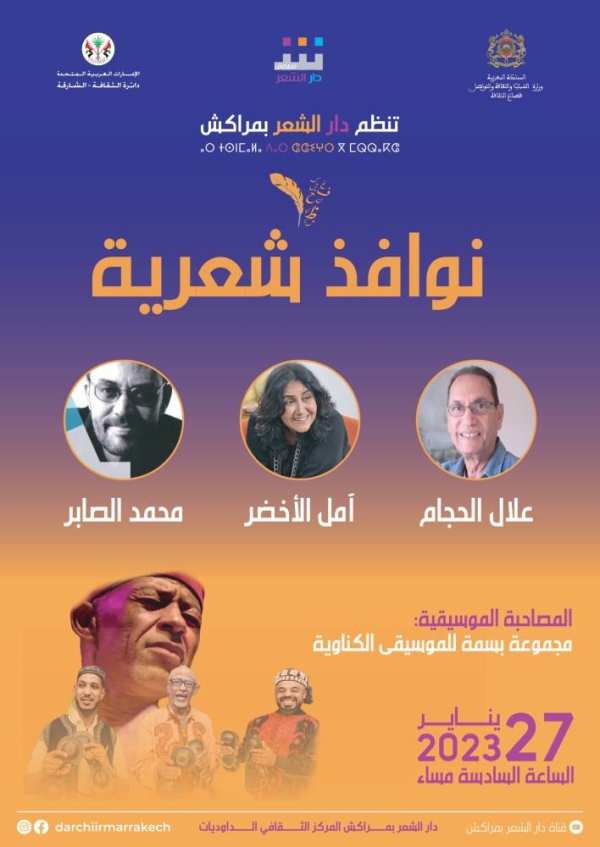 تواصل دار الشعر بمراكش الاحتفاء بشجرة الشعر المغربي الوارفة، ضمن برمجتها للموسم السادس.. وهكذا يلتقي جمهور الدار مع الشعراء: علال الحجام وأمل الأخضر ومحمد الصابر وفرقة بسمة للموسيقى الكناوية، برئاسة الفنان عبدالجليل قدسي، في أمسية شعرية وفنية جديدة بفضاء الدار بالمركز الثقافي الداوديات، وذلك يوم غد الجمعة 27 يناير الجاري على الساعة السادسة مساء. أجيال القصيدة المغربية الحديثة يفتحون نوافذ شعرية جديدة، وقراءات شعرية، بتواشج مع عمق الجنوب على إيقاع موسيقى كناوة.. صوت الذات، وهي تصبغ كينونتها من خلال القصيدة، وأفق الكتابة وسؤال الوجود.