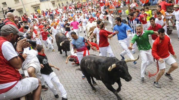 وفي إطار احتفالات سان فيرمين التي ت قام سنويا بين 6 و 15 تموز/يوليو، يحاول المئات من العدائين وهم يرتدون قمصانا بيضاء ويضعون أوشحة حمراء، الاقتراب إلى أقصى حد ممكن من ستة ثيران خلال سباق يمتد على 850 مترا في شوارع المدينة المعبدة بالحصى.