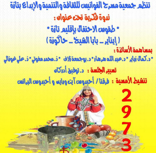 في إطار أنشطتها الثقافية والفكرية والفنية الخاصة بتثمين التراث المادي واللامادي بإقليم تازة، واحتفالا بحلول السنة الأمازيغية الجديدة، تنظم جمعية مسرح الفوانيس للثقافة والتنمية والإبداع بتازة، ندوة فكرية تحت عنوان “طقوس الاحتفال بإقليم تازة: إيناير – بابا الشيخ – حاكَوزة”.