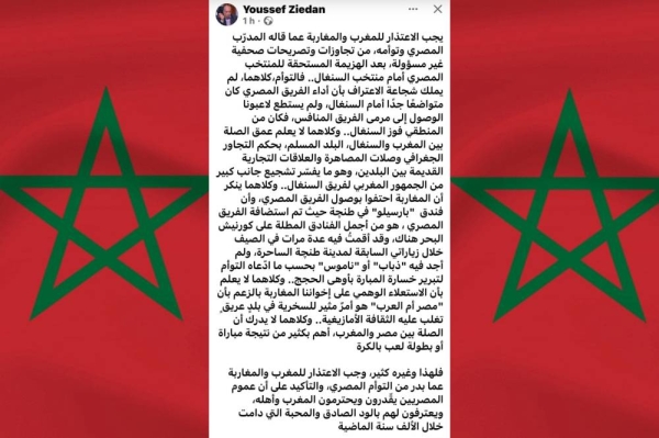 وختم الكاتب والروائي المصري تدوينته بالتأكيد على أن العلاقات بين مصر والمغرب “أكبر وأهم من نتيجة مباراة كرة قدم”، داعيا إلى الاعتذار للمغرب والمغاربة، والتشديد على أن عموم المصريين يقدّرون المغرب وأهله، وتجمعهم بهم روابط مودة واحترام متبادل امتدت لأكثر من ألف عام.