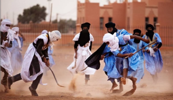 يرتدي أعضاء أحد الفريقين “دراعيات” باللون الأزرق، بينما اختار أعضاء الفريق الثاني اللون الأبيض لهذه الجلابيب الرجالية الخفيفة الواسعة الانتشار في الصحراء، وغطوا رؤوسهم ووجوههم “باللثام” الأسود الذي يحتمي به الرحل والصحراويون بشكل عام من قساوة الطقس.