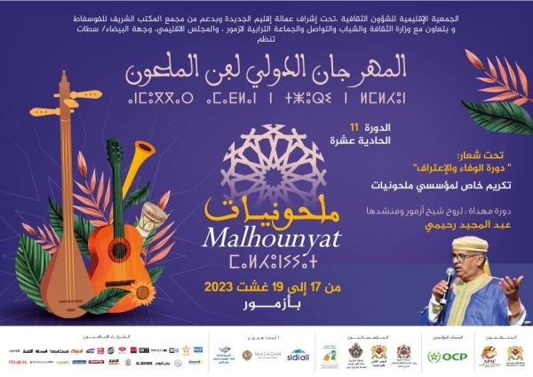 يجدد المهرجان الدولي ملحونيات بأزمور، موعده مع عشاقه ومتتبعيه، في دورته الحادية عشرة التي تلتئم أيام 17 و18 و19 من شهر غشت الجاري تحت شعار “دورة الوفاء والاعتراف” . وهي دورة تنظمها الجمعية الإقليمية للشؤون الثقافية تحت إشراف عمالة الجديدة والراعي المؤسس المجمع الشريف للفوسفاط ، وبتعاون مع وزارة الشباب والثقافة والتواصل وجماعة أزمور والمجلس