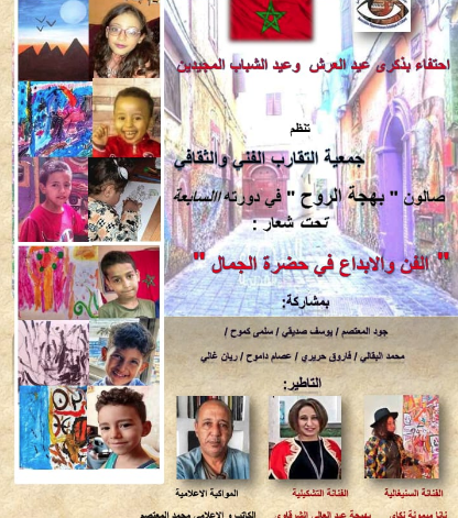 احتفاء بذكرى عيد العرش ، وعيد الشباب المجيدين ، تنظم جمعية التقارب الفني والثقافي ، صالون ” بهجة الروح ” في دورته السابعة ، تحت شعار :” الفن والابداع في حضرة الجمال ” ، وذلك من 27 الى 29 يوليوز 2023 بمقر الجمعية بدرب خروبة بالمدينة القديمة بالدار البيضاء.