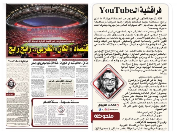لماذا ينزعج القاطنون في اليوتوب من الصحافة الورقية؟ ما الذي يزعج أشخاصا لديهم صفحات يقولون إنها مليونية، وتشاهدها عشرات، بل مئات، بل آلاف مليارات الناس، من جريدة يتلوها فقط مديرها وصحبه؟ ما الذي يجعل أناسا يفترض أنهم يتحكمون في الرأي العام، بسبب المنتوج اليومي الذي يقدمونه بإسهال واستسهال مثيرين للشفقة، يقررون أن معركتهم الأساس، هي ضد جريدة قادمة من تسعينيات القرن الماضي، رأسمالها الفعلي والحقيقي، قدرتها على البقاء واقفة على خط الوضوح الكامل مع الوطن، مع الشعب، مع الانتماء الجماعي للمغرب وللمغاربة؟