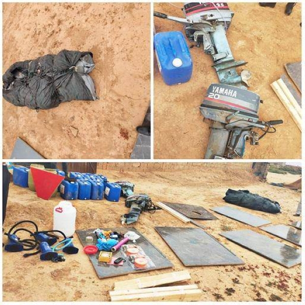 و أسفرت عملية التفتيش التي تمت على مستوى منزل يقع بمنطقة واعرون، عن حجز معدات للملاحة البحرية، وهي عبارة عن قارب مطاطي وألواح خشبية ومحركين بحريين، و كذا بوصلة وجهاز تحديد المواقع البحرية، بالإضافة إلى 14 حاوية معبأة بالبنزين.
